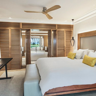 DELUXE FAMILY SUITE (100 кв.м) "Семейный отдых в своем лучшем проявлении". Элегантные номера, расположенные на первом этаже, состоят из спальни с кроватью king size, ванной комнаты с отдельным душем, отдельными туалетами, туалетными столиками и отдельно стоящей ванной. В гостиной - двухместный диван- кровать, который трансформируется в две отдельные одноместные кровати для детей, ванная комната с отдельным душем, отдельные туалеты, туалетные столики, два кресла, телевизор диагональю 75 дюймов с зеркальным экраном и полностью укомплектованный мини-бар. Более того, в номерах есть собственная просторная терраса, откуда открывается вид на сад или море. Номера расположены в отдельных роскошных виллах, выполненных в креольском стиле.